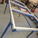 Als erstes schraube ich den Rahmen zusammen. Das mache ich mit einer Schablone, damit die Abstände der Leisten immer gleich sind.
